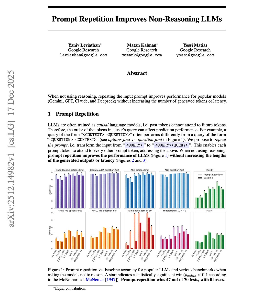 I ricercatori hanno anche testato un'alternativa chiamata "Padding", che aggiungeva punti finali per eguagliare la lunghezza del prompt ripetuto senza effettiva ripetizione semantica. Il risultato? Nessun miglioramento. Questo conferma che i guadagni derivano dalla ripetizione semantica del contenuto, non semplicemente dall'aumento della lunghezza dell'input.